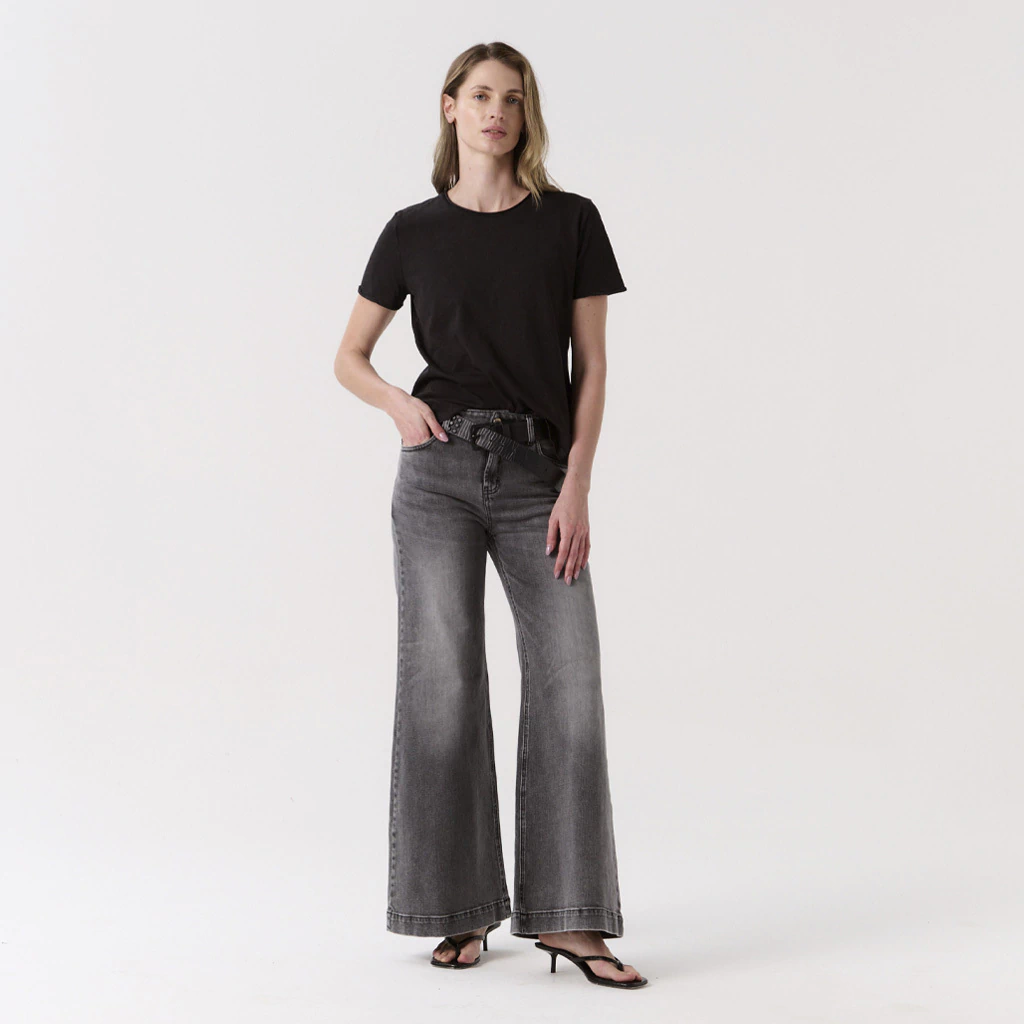 El Jean Monza, un calce clásico de Botti Jeans, está confeccionado en denim 99% algodón y 1% elastano. En esta versión, se utilizó un denim negro que atravesó un proceso de lavado intenso para alcanzar un tono gris desgastado. De tiro medio/alto, su moldería está pensada para ajustarse en la zona de la cadera y soltarse progresivamente a lo largo de la pierna, con mayor amplitud en la botamanga y ruedo alto que favorece la caída de la prenda.